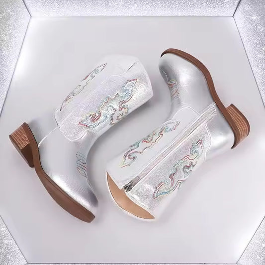 Kids Girls Fashion Metallic Cowboy Boots Mid-Calf Colorful Embroidery Side Zipper Low Heel Party Daily Footwear Multiple Colors - CB077